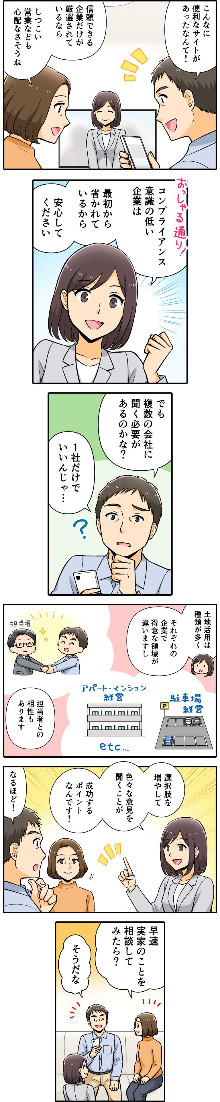相続をきっかけに、土地の活用方法について7社から見積りを取りました。知識が全くなかったのでまずは各社の強みを聞き取りして、それから自分に合いそうな提案をしてくれた1社に絞っていきました。