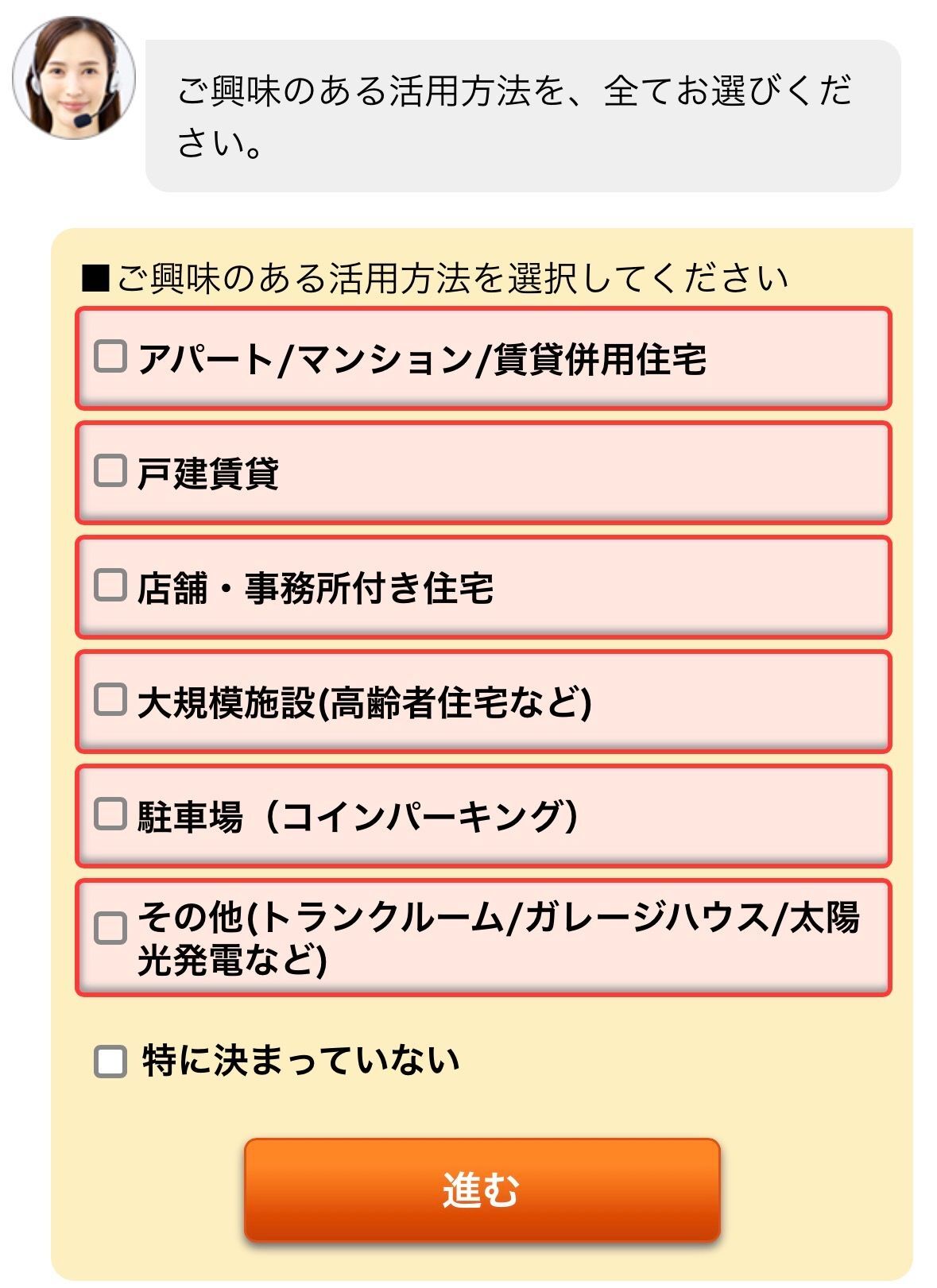 フォームには「駐車場」や「大規模施設(老人ホーム)」の項目もございますので、すでにこれらをご検討中の方は該当の項目をお選びください。